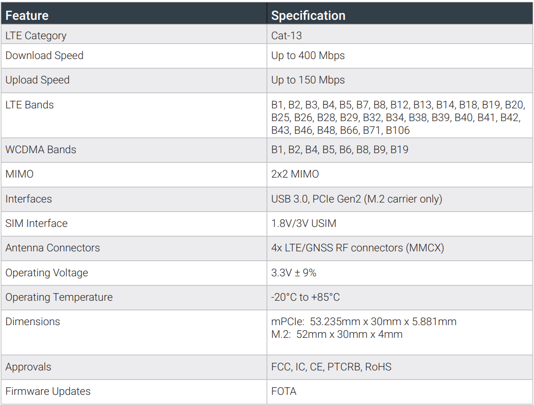**LTE-Advanced Pro Cat-13:** Peak download speeds up to 400 Mbps and upload speeds up to 150 Mbps.\
