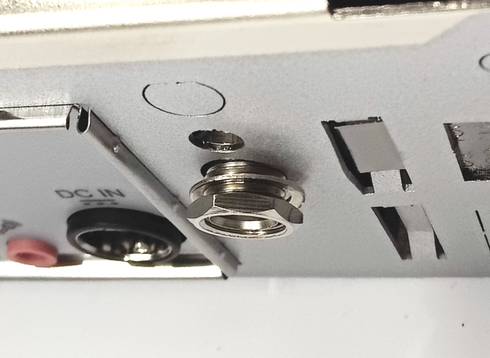 * Install the washer and then the nut onto the DC jack from the outside of the case.