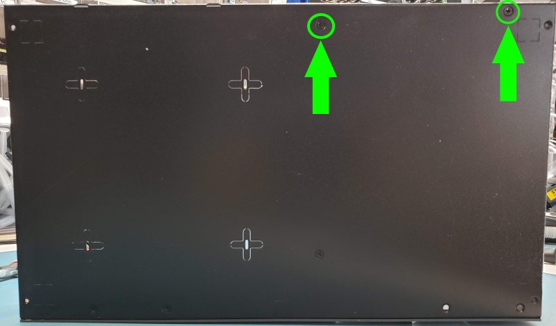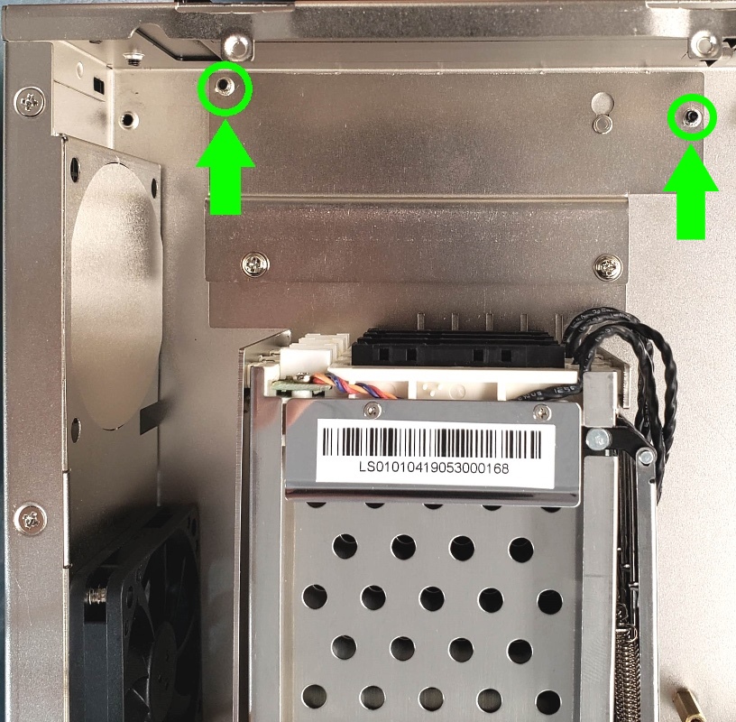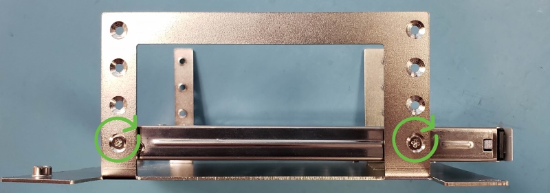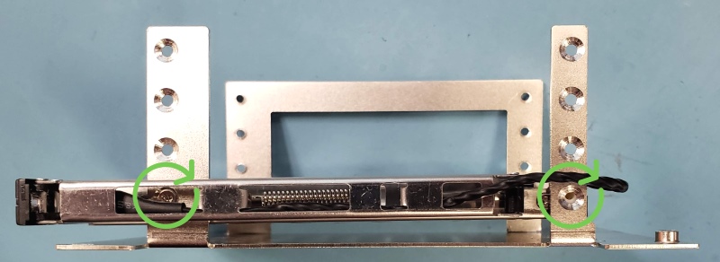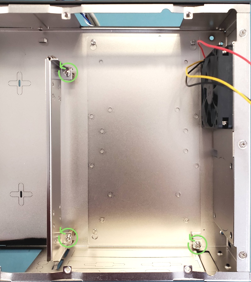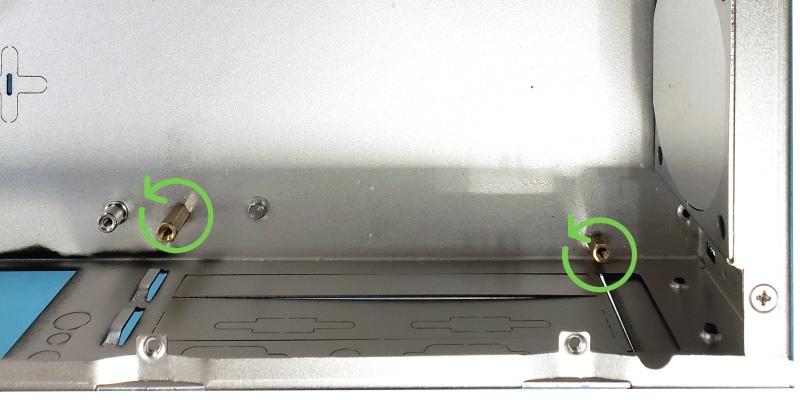 * Using the screws from the standoffs removed previously (or spares from the accessory box), install screws up through the bottom of the case to hold the bracket in place