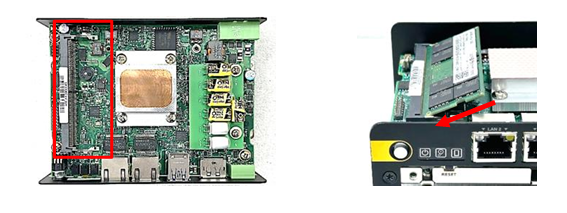 The SO-DIMM socket is indicated on the left. The angle of installing a RAM module is indicated on the right.