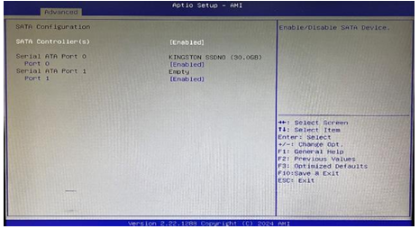 Press DEL to enter BIOS. Navigate to Advanced → SATA Configuration. Check if the BIOS detects an SSD in the corresponding SATA port (see below).