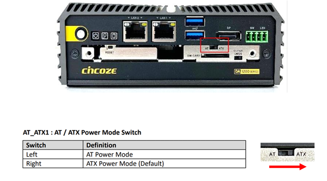 This test will check the system’s power button. Unplug the DC-IN power cable and set the system to ATX mode by moving the switch to the right.