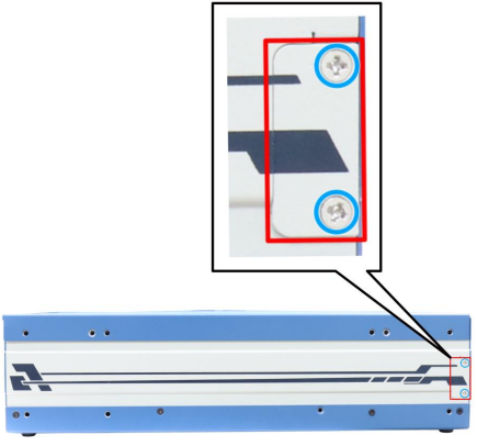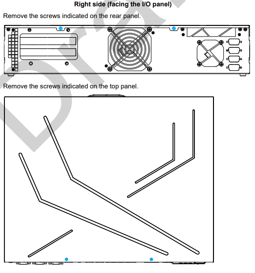 Remove the screws (indicated in blue) on the side panel, and the remove the trap door (indicated in red).