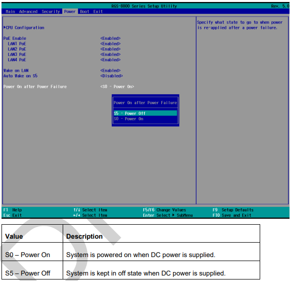 Scroll down to highlight [Power On after Power Failure], press ENTER to bring up setting options, S0 – Power On or S5 – Power Off, and press ENTER to select the setting.