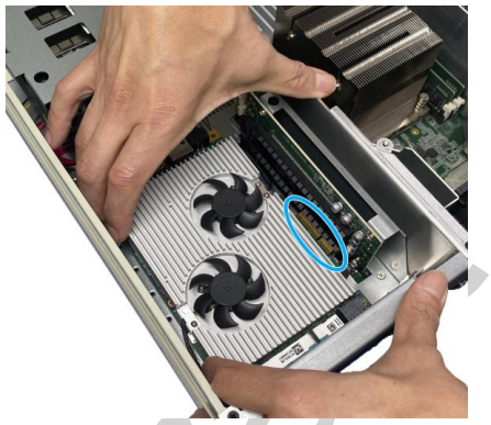 Take the PCIe card out of its box/ static bag, align and insert the goldfingers into the PCIe slot. There are two slots available, it is recommended to install into the bottom slot first.