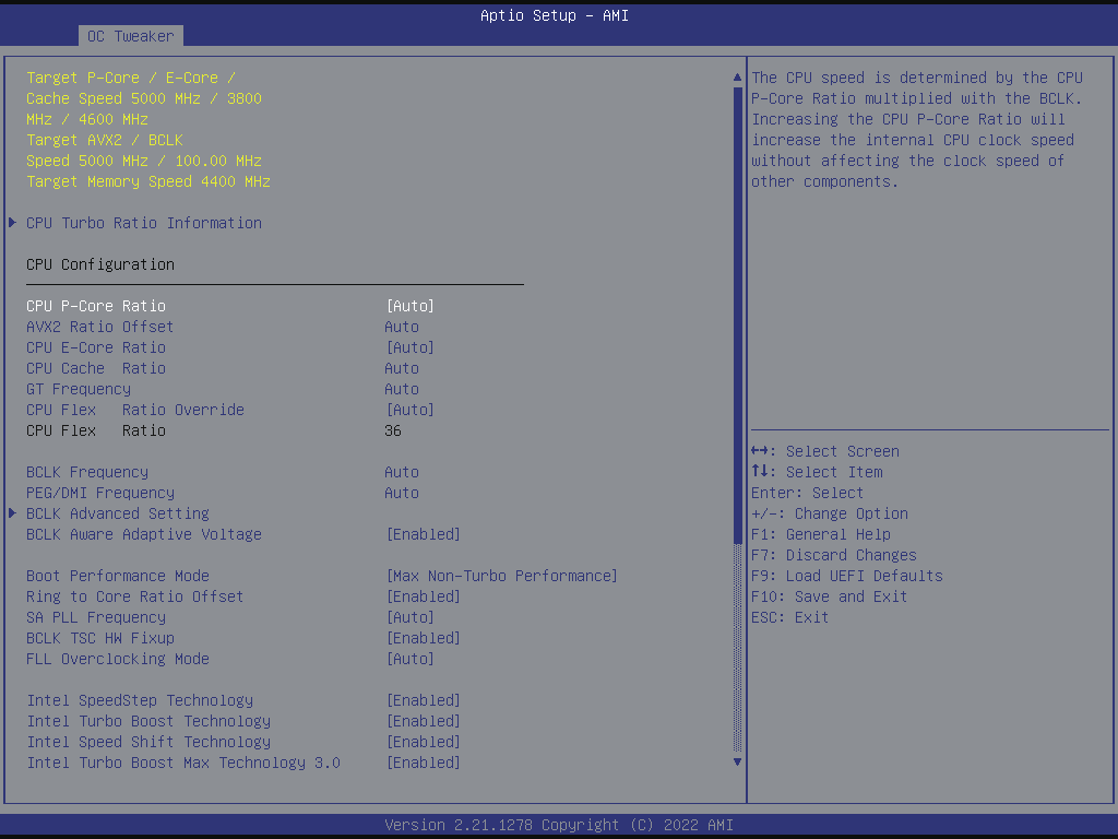 The CPU speed is determined by the CPU P-Core Ratio multiplied by the BCLK. Increasing the CPU P-Core Ratio will increase the internal CPU clock speed without affecting the clock speed of other components.