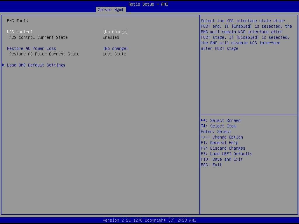 Select this KCS interface state after POST end. If [Enabled] us selected, the BMC will remain KCS interface after POST stage. If [Disabled] is selected, the BMC will disable KCS interface after POST stage.