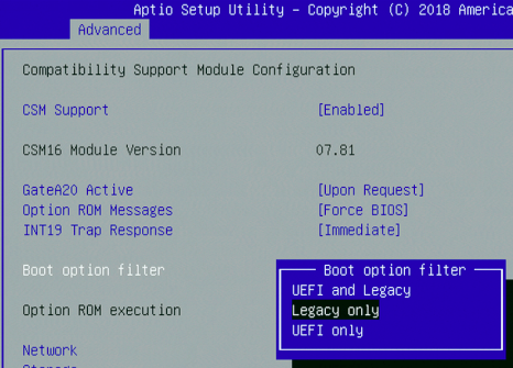 * On newer systems, it is necessary to enable CSM / legacy boot mode as shown.