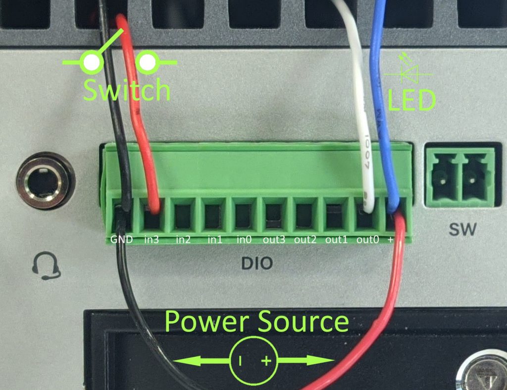 For this tutorial we’ll borrow the USB port’s 5V and GND pins and splice a spare USB cable for use in the DIO port.