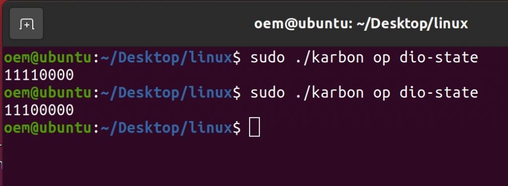 Running the karbon tool with the \`op dio-state’ will print out what the input and output states are. The output bit order is I0 I1 I2 I3 O0 O1 O2 O3\