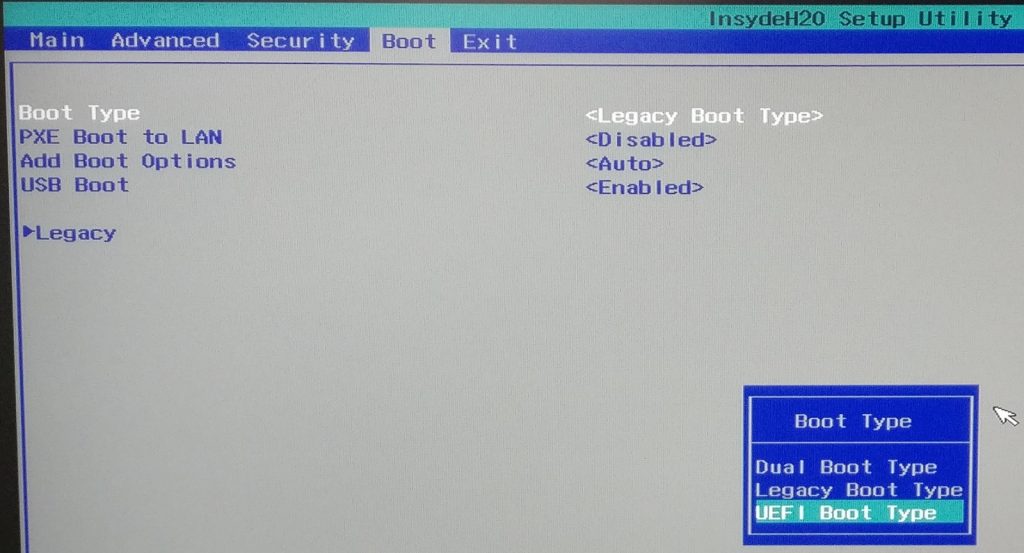 * Next, navigate over to the Boot tab and change the Boot Type to Legacy