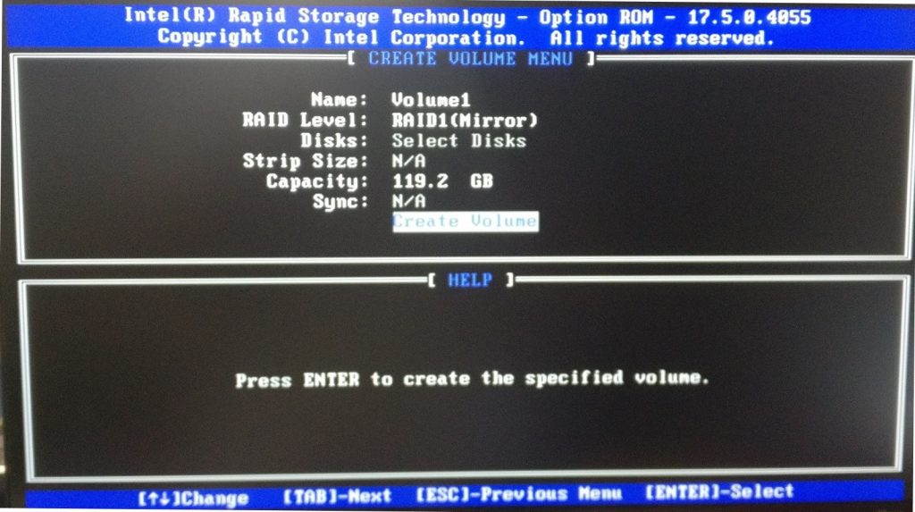 * Tab down to “Create Volume” and press enter
