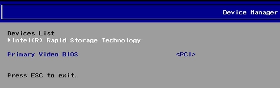 * From the main menu, select “Device Management”. You will be greeted with the Device Manager options pictured below. Select “Intel(R) Rapid Storage Technology” to continue.