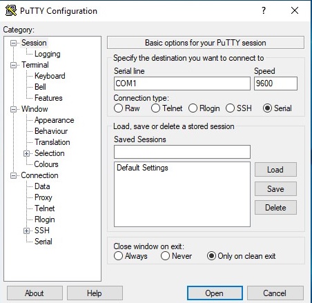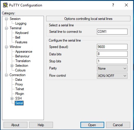 Opening PuTTY the com port we ran the loop back test on can be opened and the settings can be checked to make sure they match the configuration of the Ubuntu system’s COM settings.