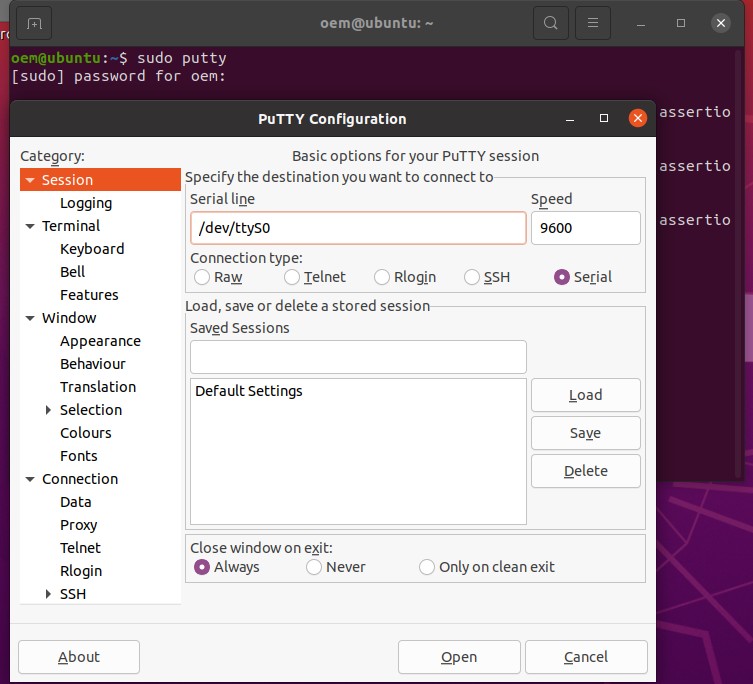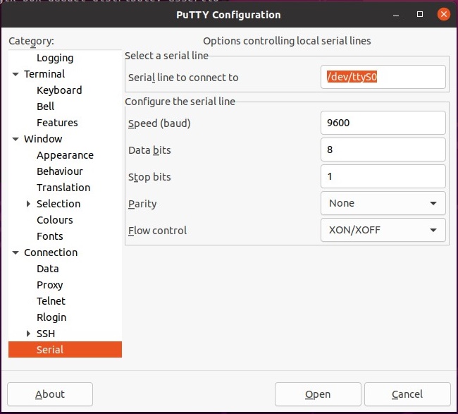 In Ubuntu we can use PuTTY to open up the /dev/ttyS0 device path we ran the loopback test on.
