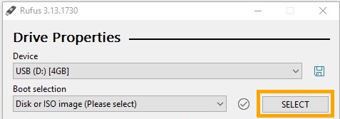 * Click Select and choose the ISO file you just downloaded.