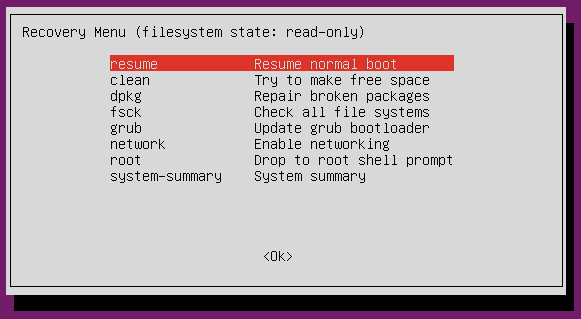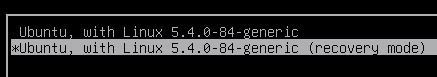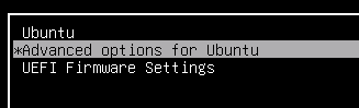 * Select “Advanced options for Ubuntu” using the down arrow and enter keys.