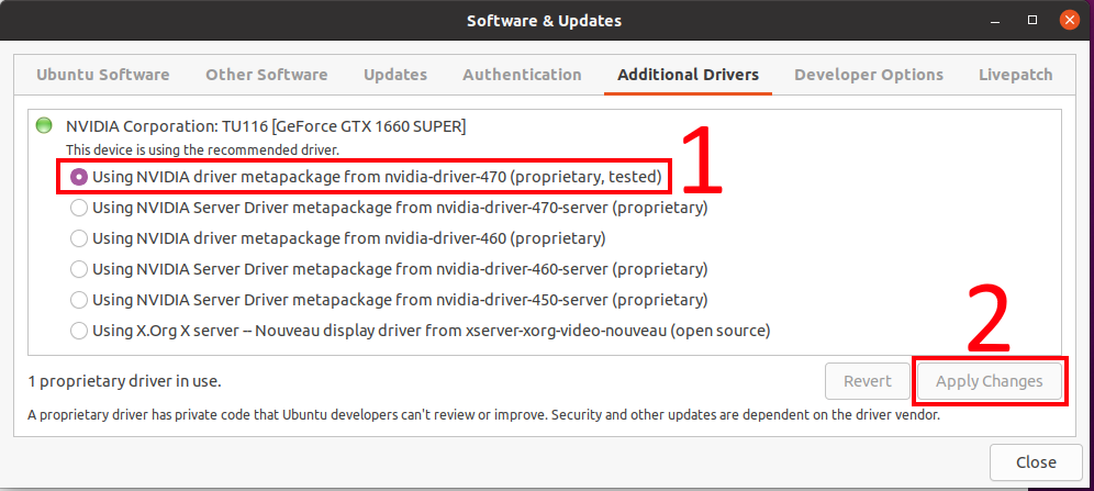 * Select the latest NVIDIA proprietary driver. It will typically be the top option