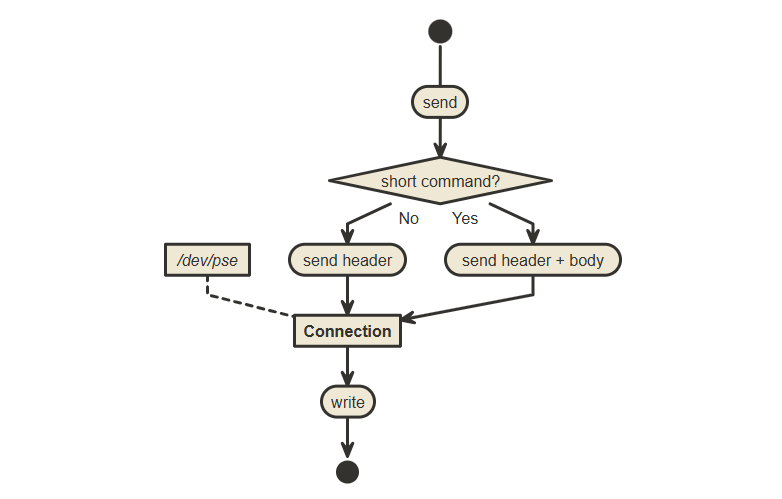 Once a message’s header and optional body portions are prepared, sending the command is as simple as writing to the open PSE device: